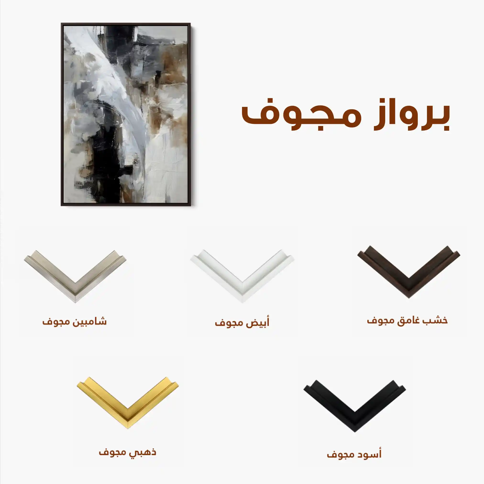 • الإطار (مجوف): إطار نحيف بفراغ رفيع يحيط باللوحة ليُبرز الحافة ويمنح ظلاً خفيفاً وإحساس صالات العرض؛ يصل جاهزاً للتعليق.