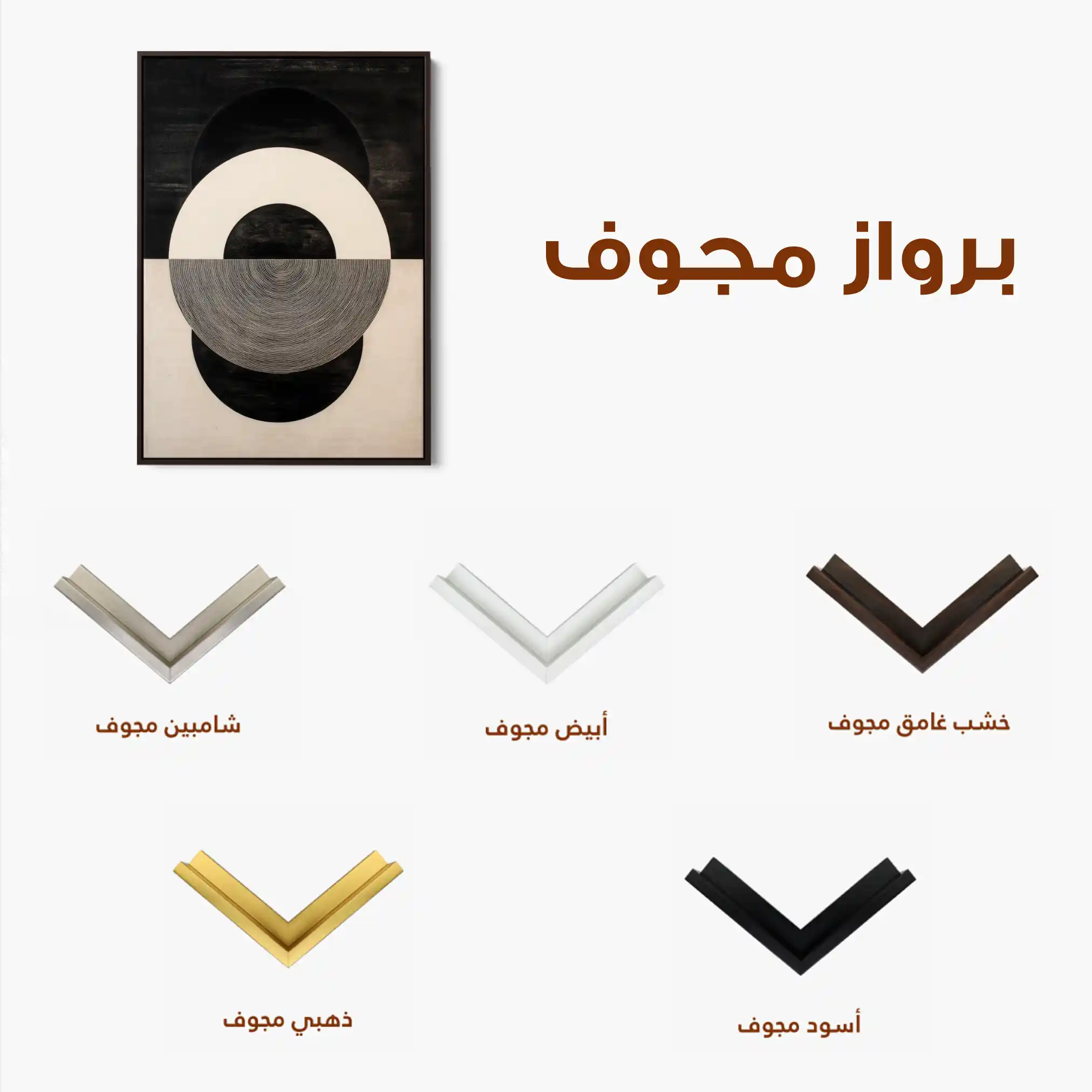 • الإطار (مجوف): إطار نحيف بفراغ رفيع يحيط باللوحة ليُبرز الحافة ويمنح ظلاً خفيفاً وإحساس صالات العرض؛ يصل جاهزاً للتعليق.