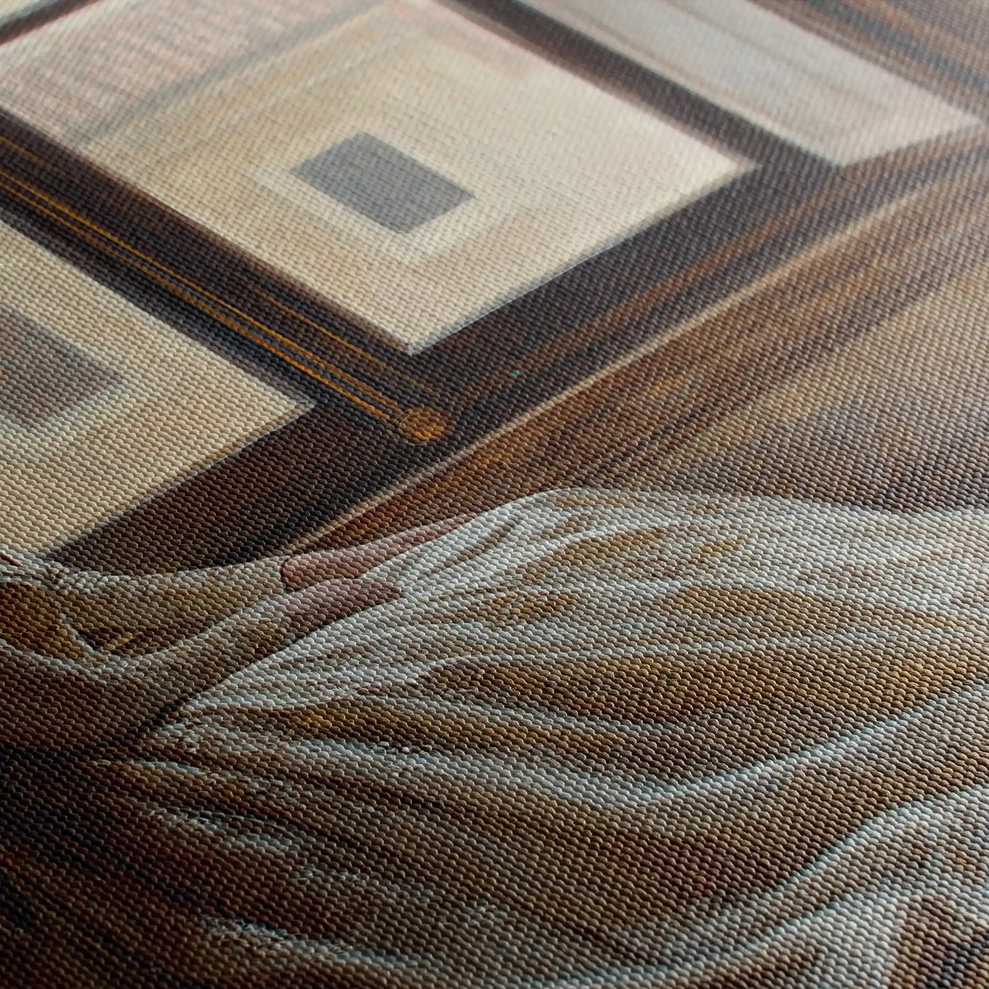 • الطباعة والمواد: طباعة فنية بأحبار أرشيفية على قماش قطني 410 جم/م² بسطح مطفي يقلّل الوهج ويبرز العمق.