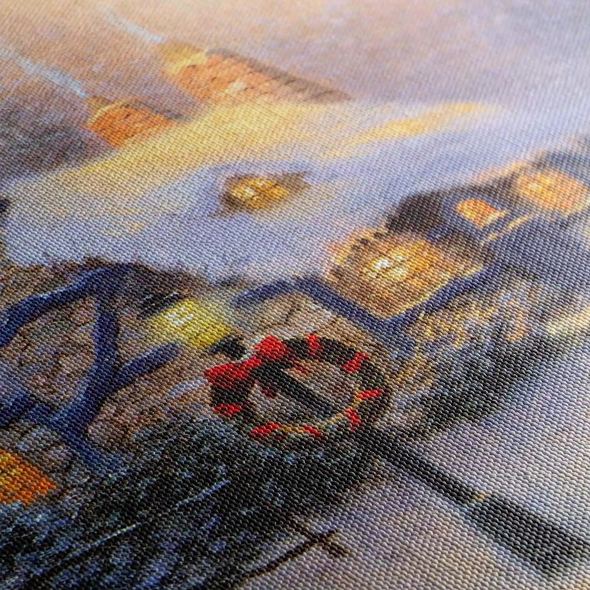 • الطباعة والمواد: طباعة فنية بأحبار أرشيفية على قماش قطني 410 جم/م² بسطح مطفي يقلّل الوهج ويبرز العمق.