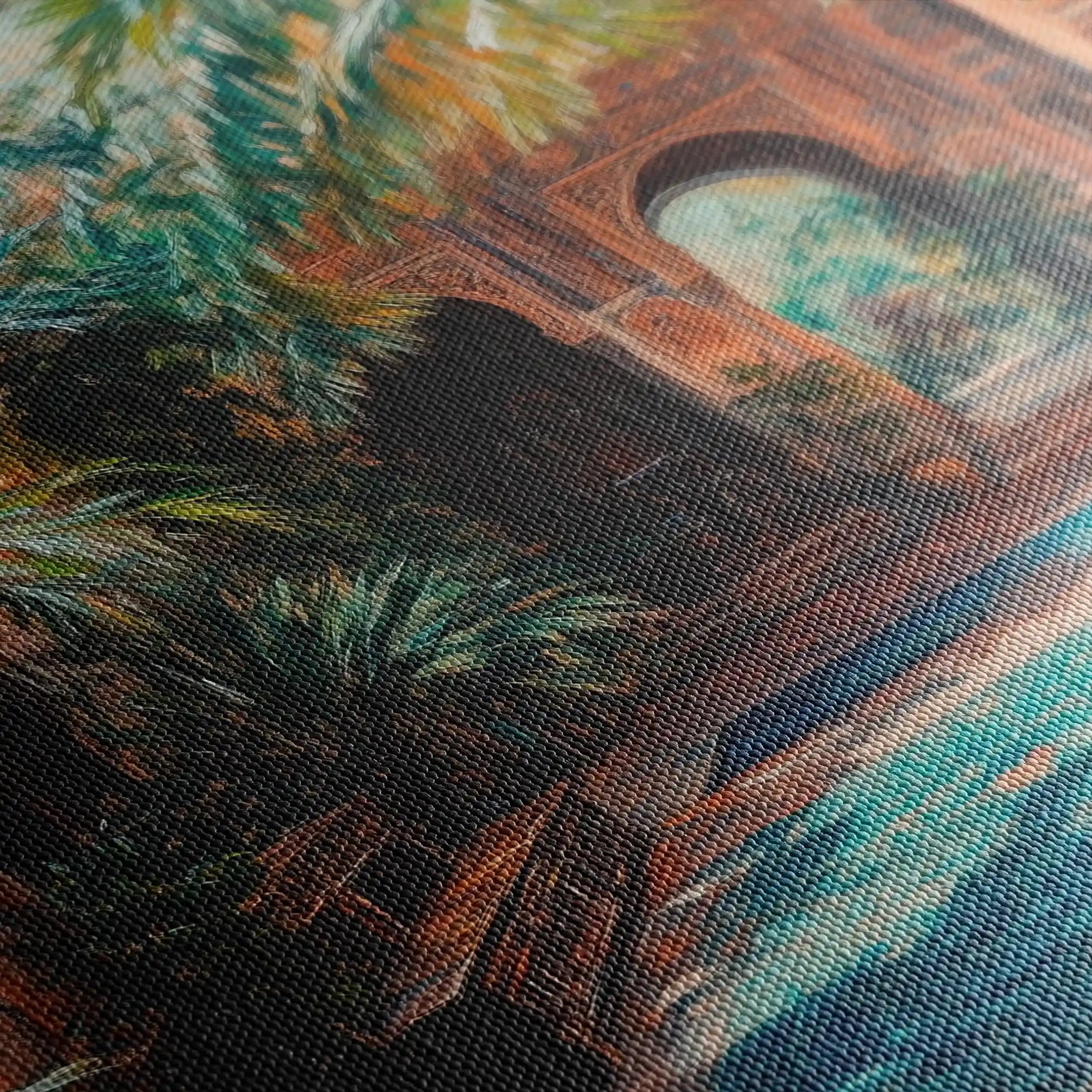 • الطباعة والمواد: طباعة فنية بأحبار أرشيفية على قماش قطني 410 جم/م² بسطح مطفي يقلّل الوهج ويبرز العمق.