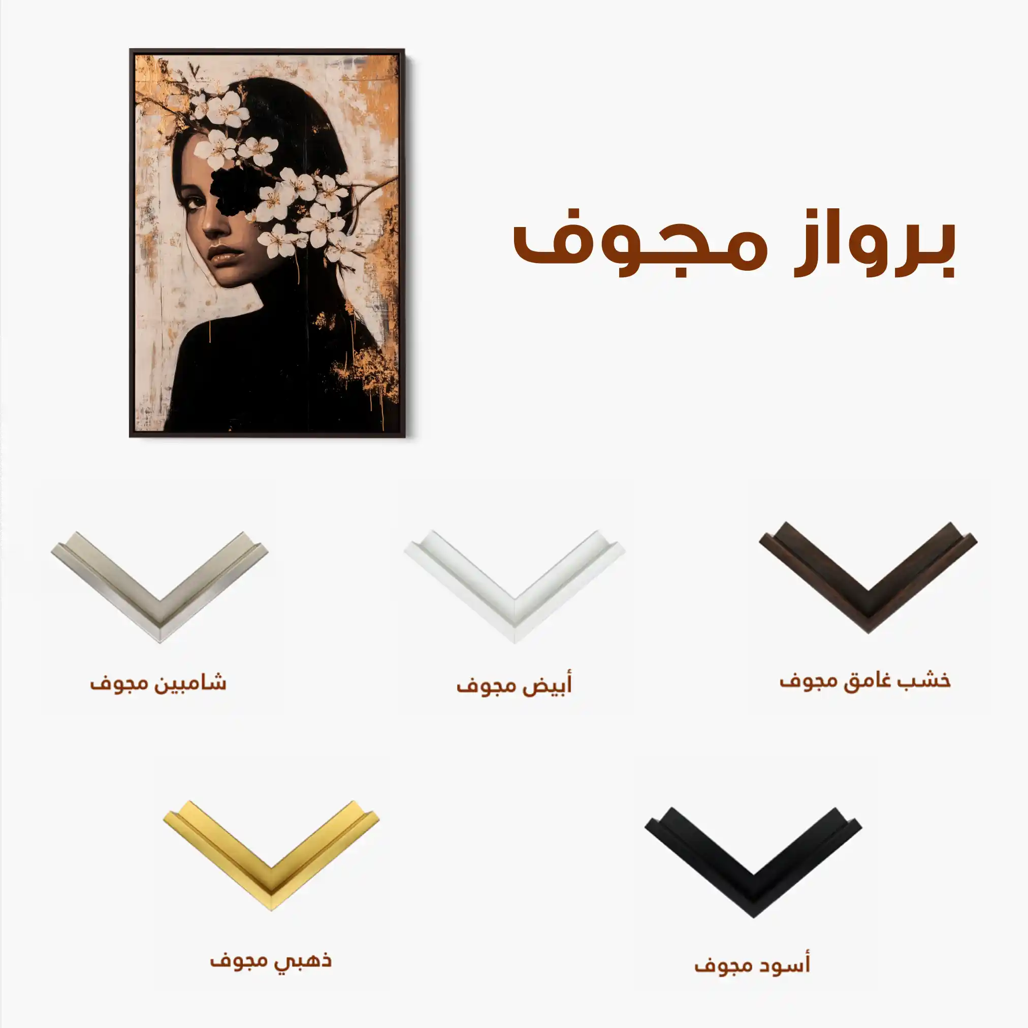 • الإطار (مجوف): إطار نحيف بفراغ رفيع يحيط باللوحة ليُبرز الحافة ويمنح ظلاً خفيفاً وإحساس صالات العرض؛ يصل جاهزاً للتعليق.