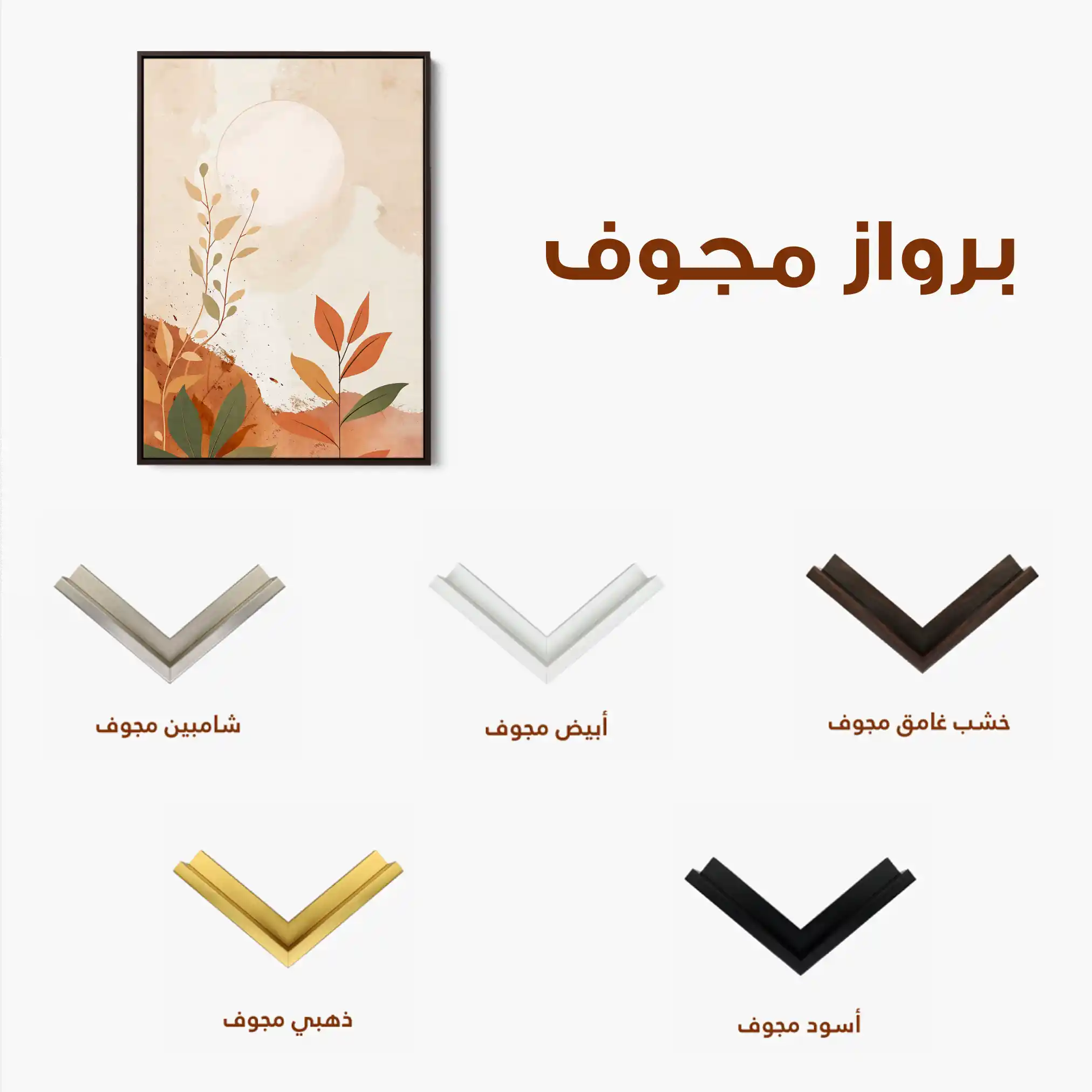 • الإطار (مجوف): إطار نحيف بفراغ رفيع يحيط باللوحة ليُبرز الحافة ويمنح ظلاً خفيفاً وإحساس صالات العرض؛ يصل جاهزاً للتعليق.
