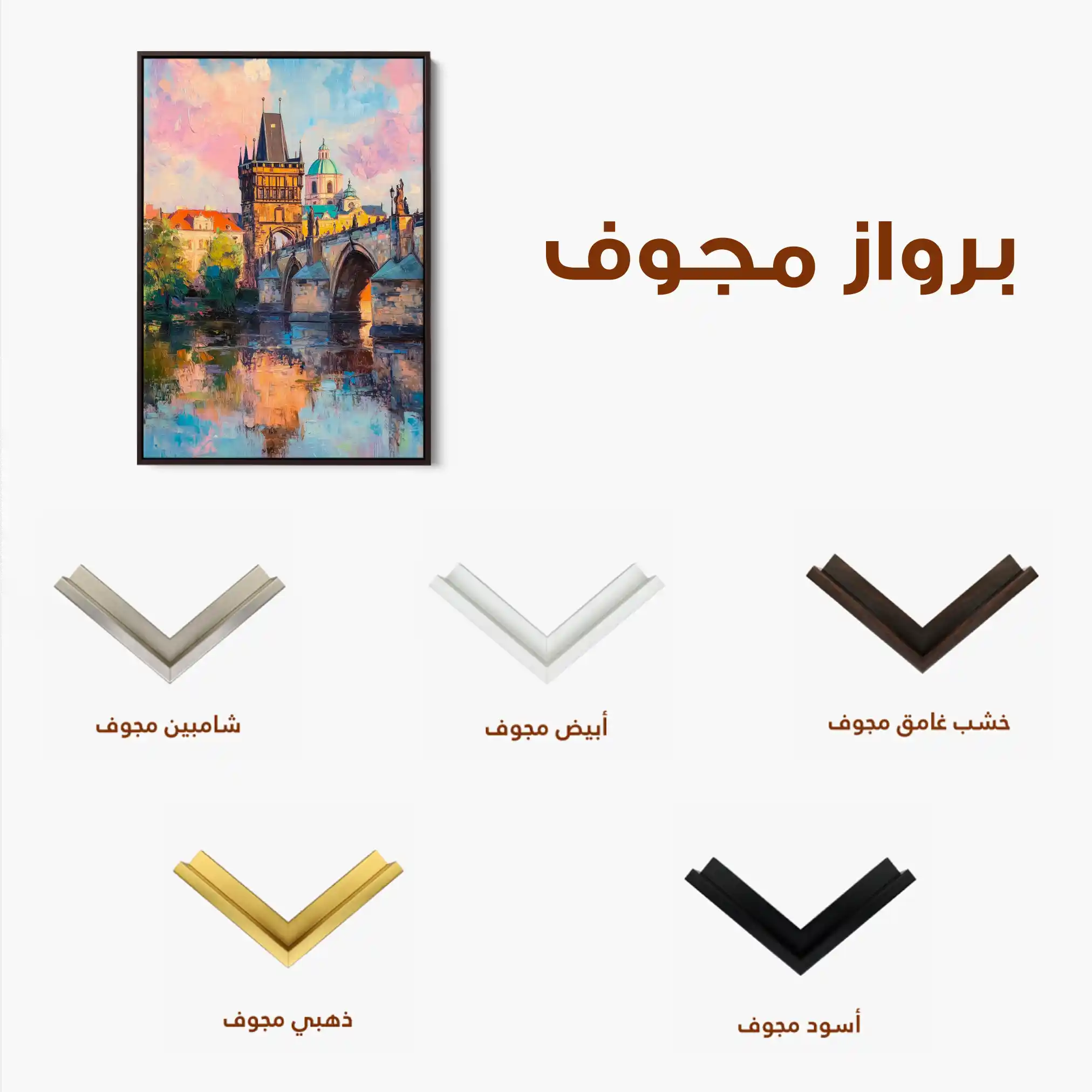 • الإطار (مجوف): إطار نحيف بفراغ رفيع يحيط باللوحة ليُبرز الحافة ويمنح ظلاً خفيفاً وإحساس صالات العرض؛ يصل جاهزاً للتعليق.