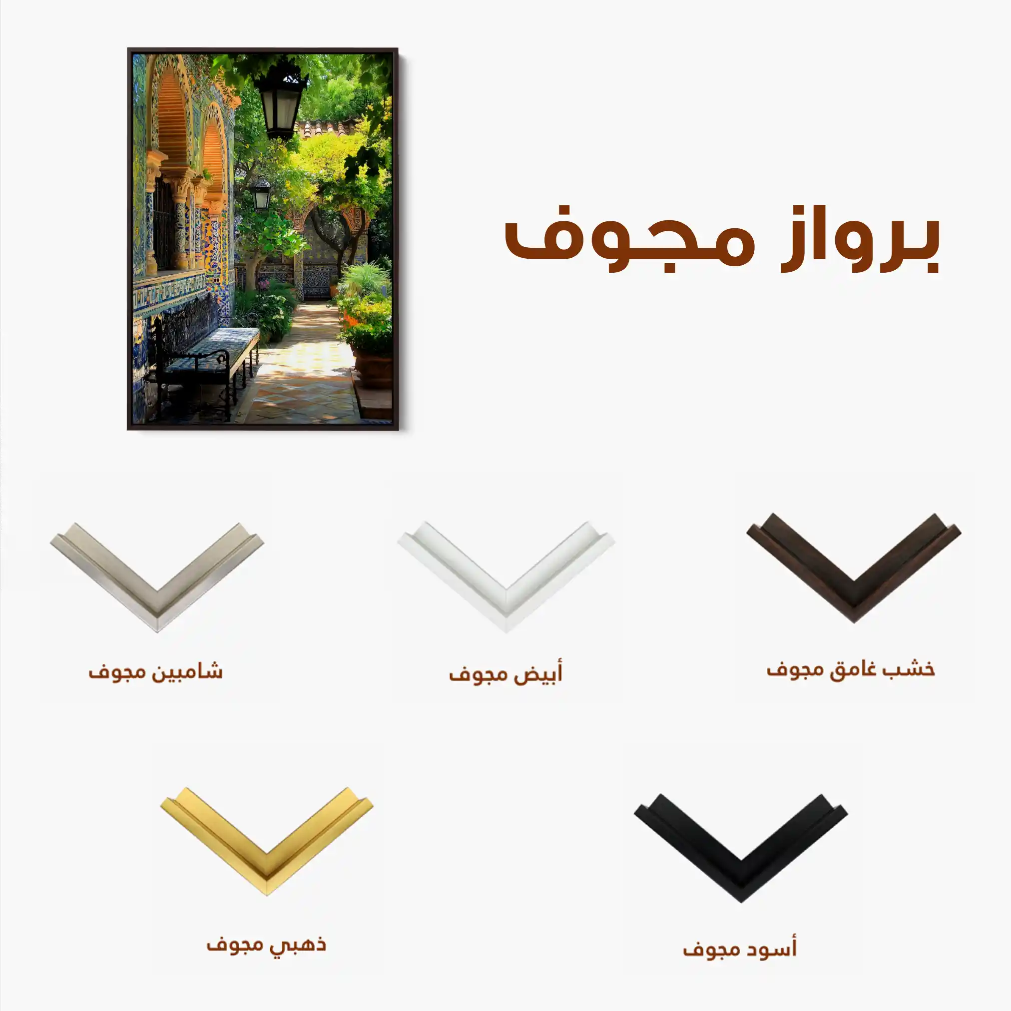 • الإطار (مجوف): إطار نحيف بفراغ رفيع يحيط باللوحة ليُبرز الحافة ويمنح ظلاً خفيفاً وإحساس صالات العرض؛ يصل جاهزاً للتعليق.