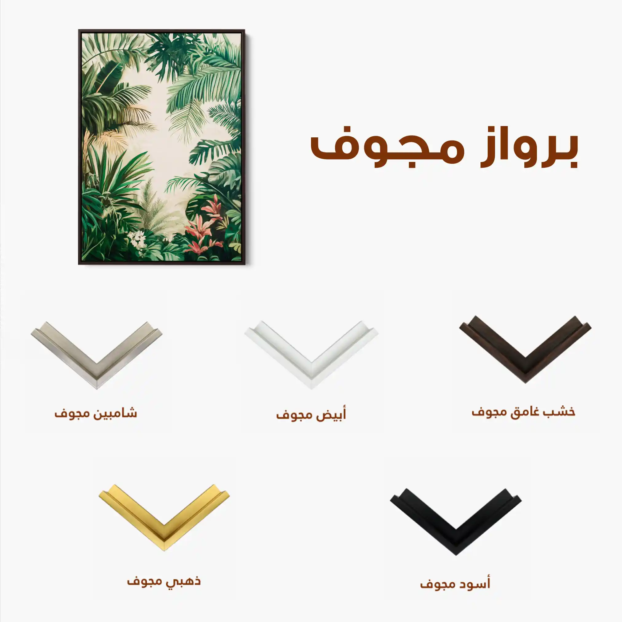• الإطار (مجوف): إطار نحيف بفراغ رفيع يحيط باللوحة ليُبرز الحافة ويمنح ظلاً خفيفاً وإحساس صالات العرض؛ يصل جاهزاً للتعليق.