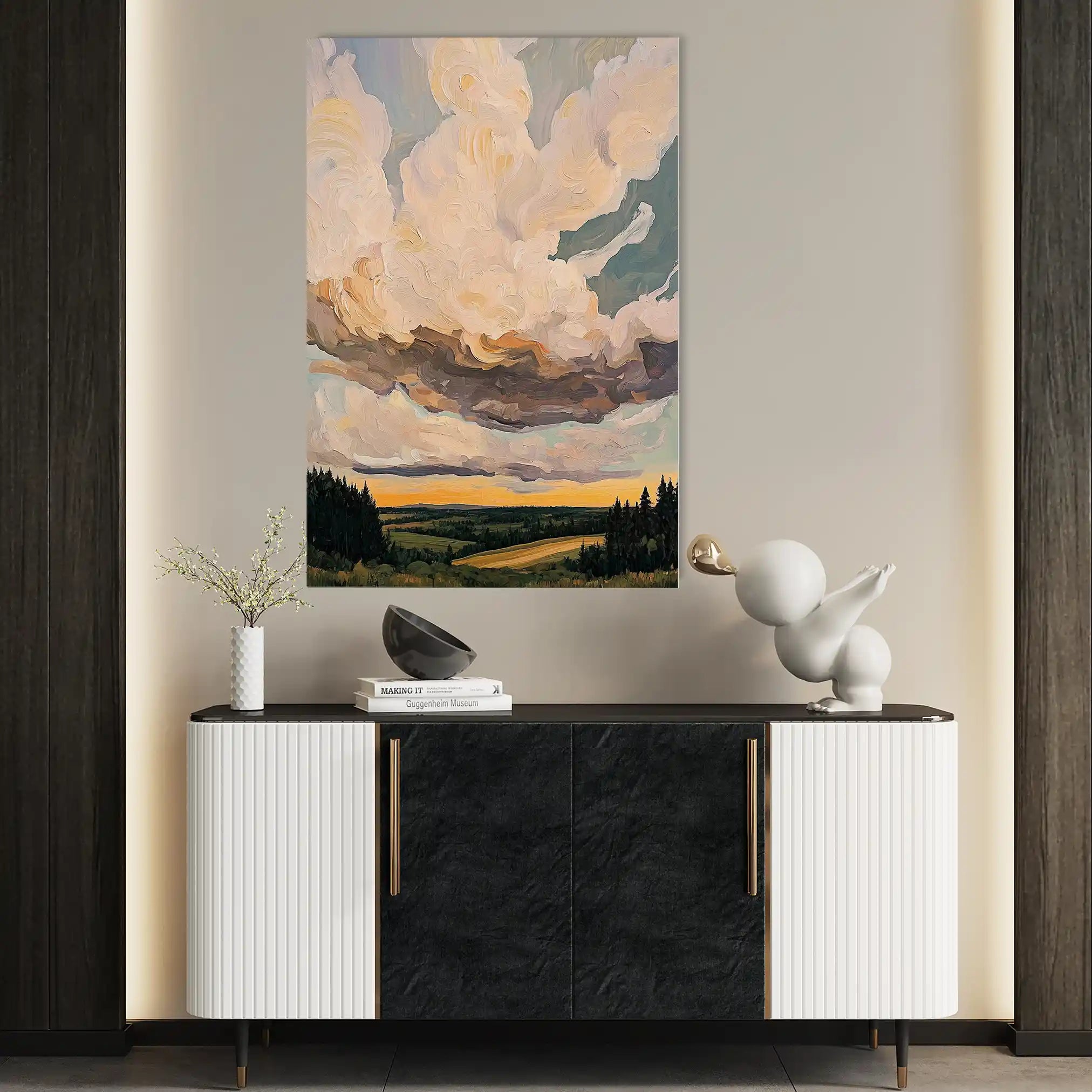• الطباعة والمواد: طباعة فنية بأحبار أرشيفية على قماش قطني 410 جم/م² بسطح مطفي يقلّل الوهج ويبرز العمق.